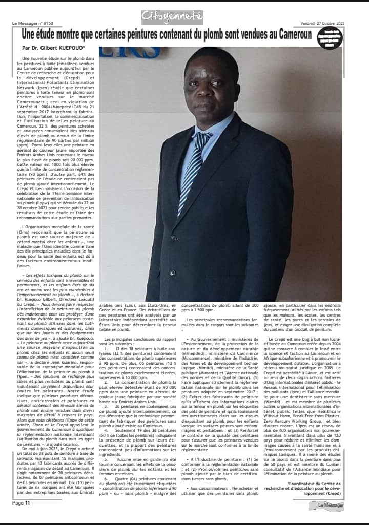 CREPD is a Cameroon based non-profit NGO created since 2004 dedicated to bridge the gap between science and action in Cameroon and sub-Sahara Africa and to promote sustainable development. The organization was granted its legal status in 2005. CREPD has a consultative status with ECOSOC and UNEA, and is active in thow international public interest NGO umbrella organizations (International POPs Elimination Network (IPEN) and the World Alliance for Mercury Free Dentistry (WAMFD)) and is member of several other international public interest organizations (Healthcare Without Harm, Break Free Plastics, Zero Mercury Working Group etc…) CREPD core activities focuse on crossed sectorial health and environmental issues and work in collaboration with government, industry, and non-governmental organizations to improve environmental governance as an essential contribution to the broad agenda of sustainable development. Arising from it experience in implementing multidonors funded projects in Cameroon and overseeing the implementation of such project in other regions of Africa, CREPD has specialized itself in advising informed decision and policy making process, as well as the national development planning on “what is needed at grassroots levels” to enable sustainable development through daily sound management of chemicals and wastes, sustainable agriculture, investigating the roots causes behind plastic pollution, poor household and solid waste management and responsible mining. Under the leadership of its Coordinator, CREPD is positioning itself as leading organization in international negotiations processes of UN chemicals and waste conventions by feeding the negotiation processes with grassroots and sound science from developing countries, fostering networks building and lobbying skills among NGOs and developing countries negotiators. Many efforts are made to entail continuous capacity building through North-South collaborative research/activities with key partners (OK International, USA; BRI, USA; Ashland University in Ohio, USA); and collaboration with Universities through student internships and volunteering programs (ENSAI, University of Ngaoundere, Adamawa Region, Cameroon). Resources (in-kind and in cash) for activities implementation at CREPD come from voluntary contribution of its members, sponsors and donors, and revenue from the services provided. CREPD currently run with six permanent staffs and many volunteers. Its financial and administrative management is guided by a “Administrative and Financial Guidance Document” adopted by the general assembly, which is the governing body of CREPD. Successful projects have been carried out on sound management of toxic chemicals (mercury (mercury monitoring in human hair and fish, mercury pollution in ASGM, mercury in batteries, mercury in health care products), lead (ULAB, Paint), cadmium (exposure to Cd and other heavy metals in ASGM)). Further successful project implemented on Persistent Organic Pollutants (POPs), namely PCBs, POP pesticides, and interventions as expert NGO in mercury, dioxins and furans inventories helped to advance the implementation of the Minamata and Stockholm Conventions in Cameroon.